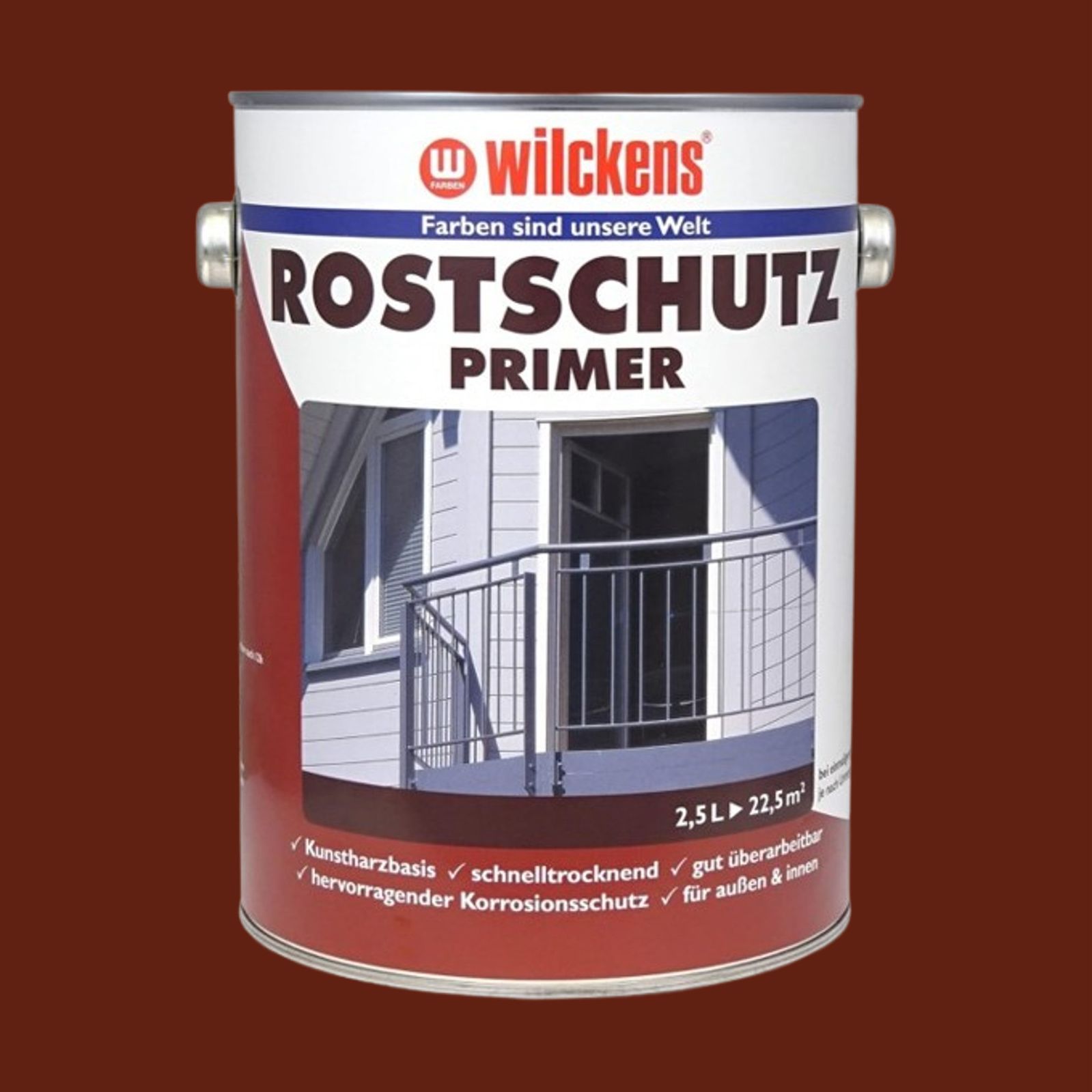 Das Rostschutzprimer von Wilckens ist eine haftvermittelnde Spezial-Kunstharz-Grundierung für den Innen und Außenbereich. Es ist für die Grundierung jeglicher Art von Eisen- und Stahluntergründe wie Zäune, Gitter, Geländer, Türen sowie Kleineisenteile geeignet. Das Produkt ist sehr hochwertig, trocknet schnell und ist hoch widerstandsfähig, zudem bietet es einen schadstoffarmen Korrosionsschutz. Der zu behandelnde Untergrund muss sauber, trocken, tragfähig, rost- und fettfrei sein. Entfernen Sie lose Anstrichteile und nicht tragfähige Untergründe und schleifen Sie gut haftende Altanstriche gründlich an. Wir empfehlen Ihnen bei diesem Vorgang eine Staubmaske zu tragen. Im Fall der Fälle sollten gerosteten Metallflächen, beispielsweise mit einer Drahtbürste gut entrostet werden.